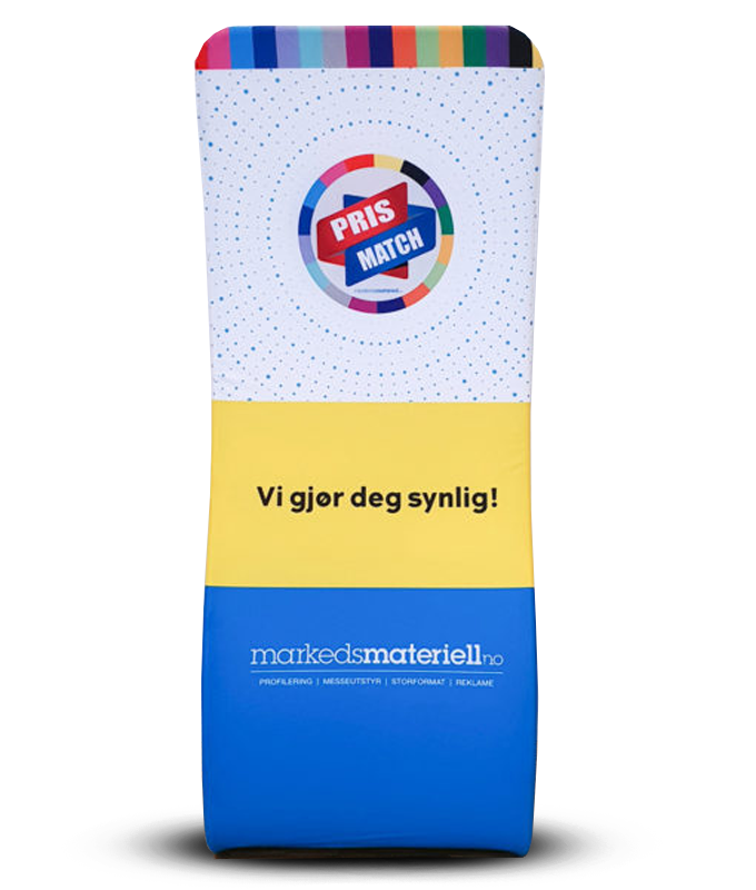 Grafisk trykk av høy kvalitet på en tekstilduk med stretch som gir stor detaljrikdom og friske farger til ditt budskap. Når du vil endre budskapet ditt kan du raskt bestille ny duk og benytte samme ramme. Enkelt og kostnadseffektivt!